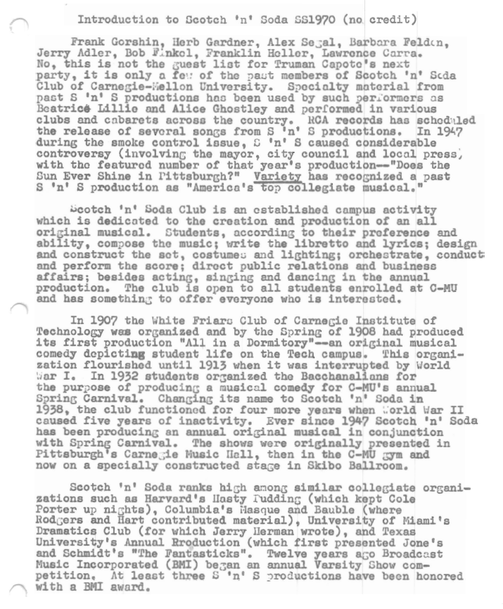 Check out this Introduction to Scotch ‘n’ Soda, written by S’n’S alumni in 1970!